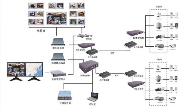 典型的電視監(jiān)控系統(tǒng)主要由前端監(jiān)視設(shè)備、傳輸設(shè)備、后端存儲、控制及顯示設(shè)備這五大部分組成,其中后端設(shè)備可進(jìn)一步分為中心控制設(shè)備和分控制設(shè)備。